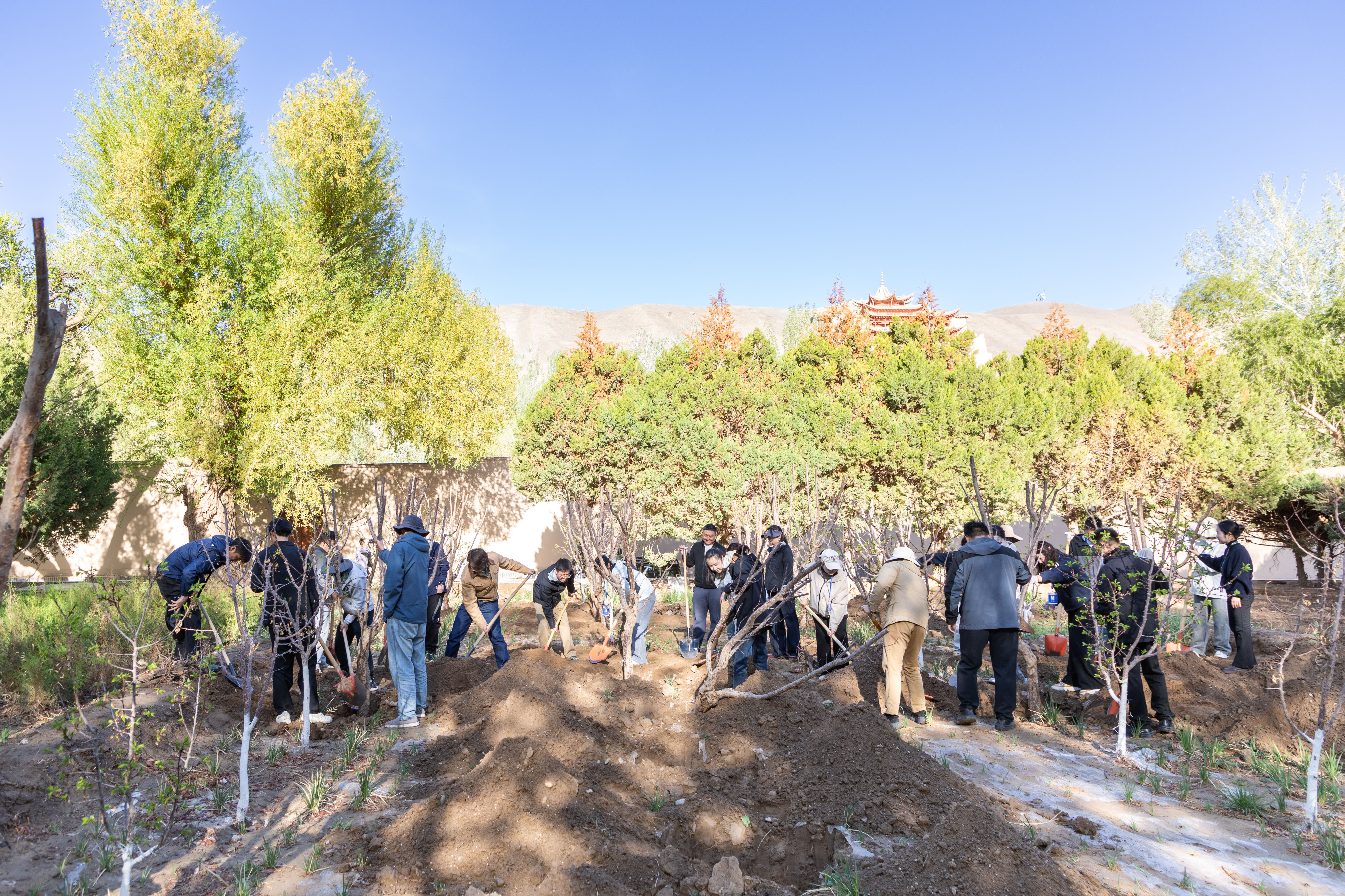 在植树劳动现场,新入职职工们分工协作,严格按照栽植规范认真挖坑、精心培土、浇水定根,亲手栽下一株株适应敦煌气候的杏树苗。一棵棵迎风挺立的“扎根树”,不仅为千年莫高窟再添新绿,更在新职工与莫高窟之间架起真挚而深沉的情感纽带,深刻寓意着新一代莫高窟人将个人理想融入敦煌文化遗产保护事业,在敦煌这片文化沃土上扎根生长、砥砺前行。