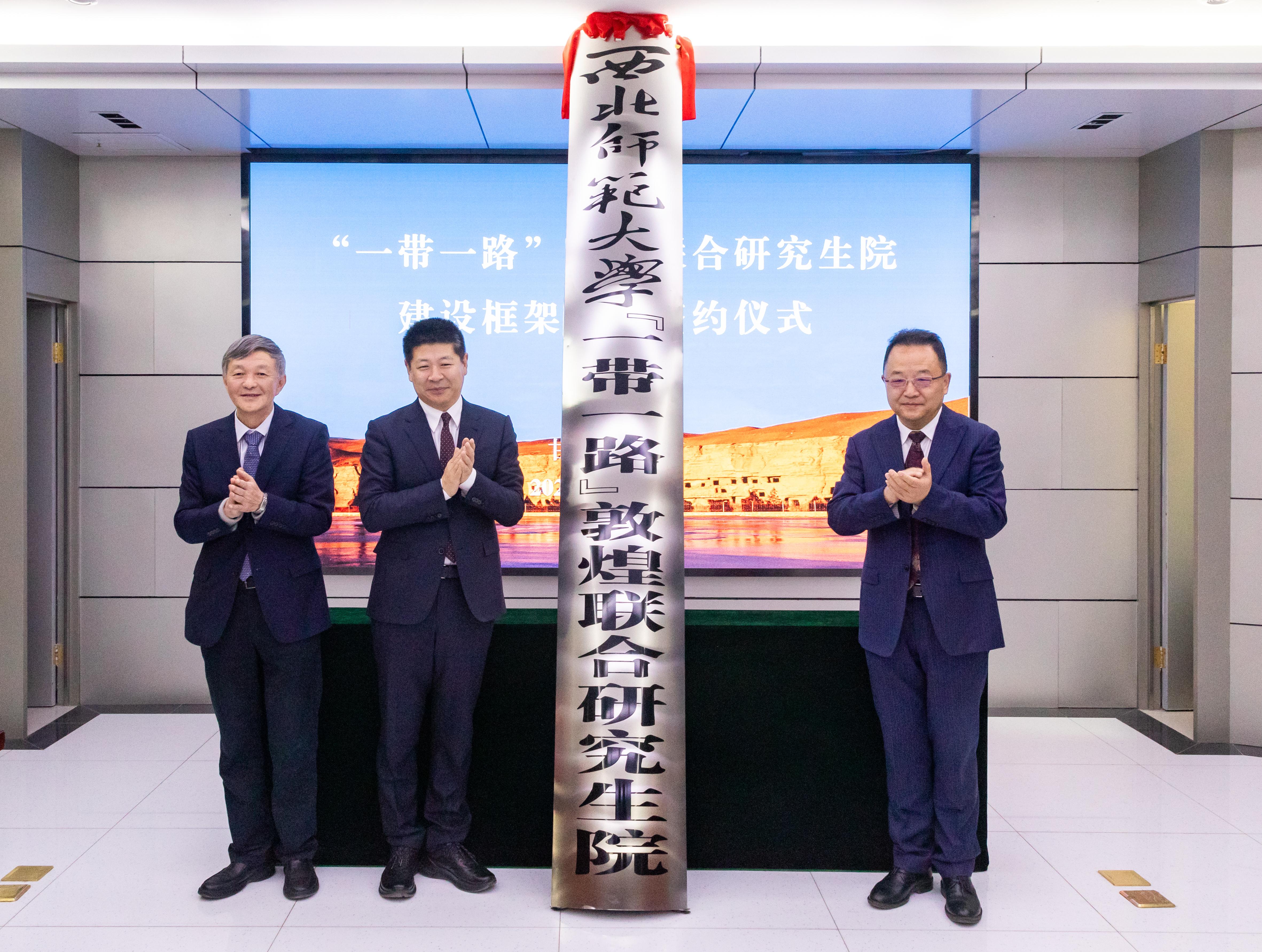 西北师范大学党委书记贾宁,酒泉市委常委、敦煌市委书记王彦群,敦煌研究院院长苏伯民共同为“一带一路”敦煌联合研究生院揭牌并见证签约。西北师范大学副校长张明军,敦煌市委常委、市政府党组副书记、市政府常务副市长付虎,敦煌研究院党委委员、副院长赵林毅代表三方签署协议。