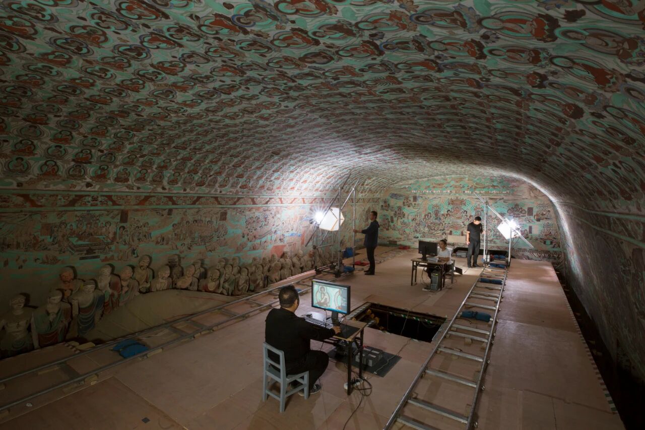 在甘肃敦煌莫高窟,如果能身临其境,与飞天共舞,自由翱翔,会是一种怎样的奇妙体验?走进敦煌研究院的“寻境敦煌——数字敦煌沉浸展”展厅,佩戴好VR设备,“飞”起来看莫高窟第285窟的梦想就能成真。挥舞左手,昏暗空间便被一盏明灯“点亮”。人似腾空而起,“飞”至洞窟顶部,原本需要抬头仰望的窟顶只需环顾便一览无余。“寻境敦煌——数字敦煌沉浸展”合成效果。(受访者供图)高捧莲花的飞天、手敲连鼓的雷公、边飞行边降...