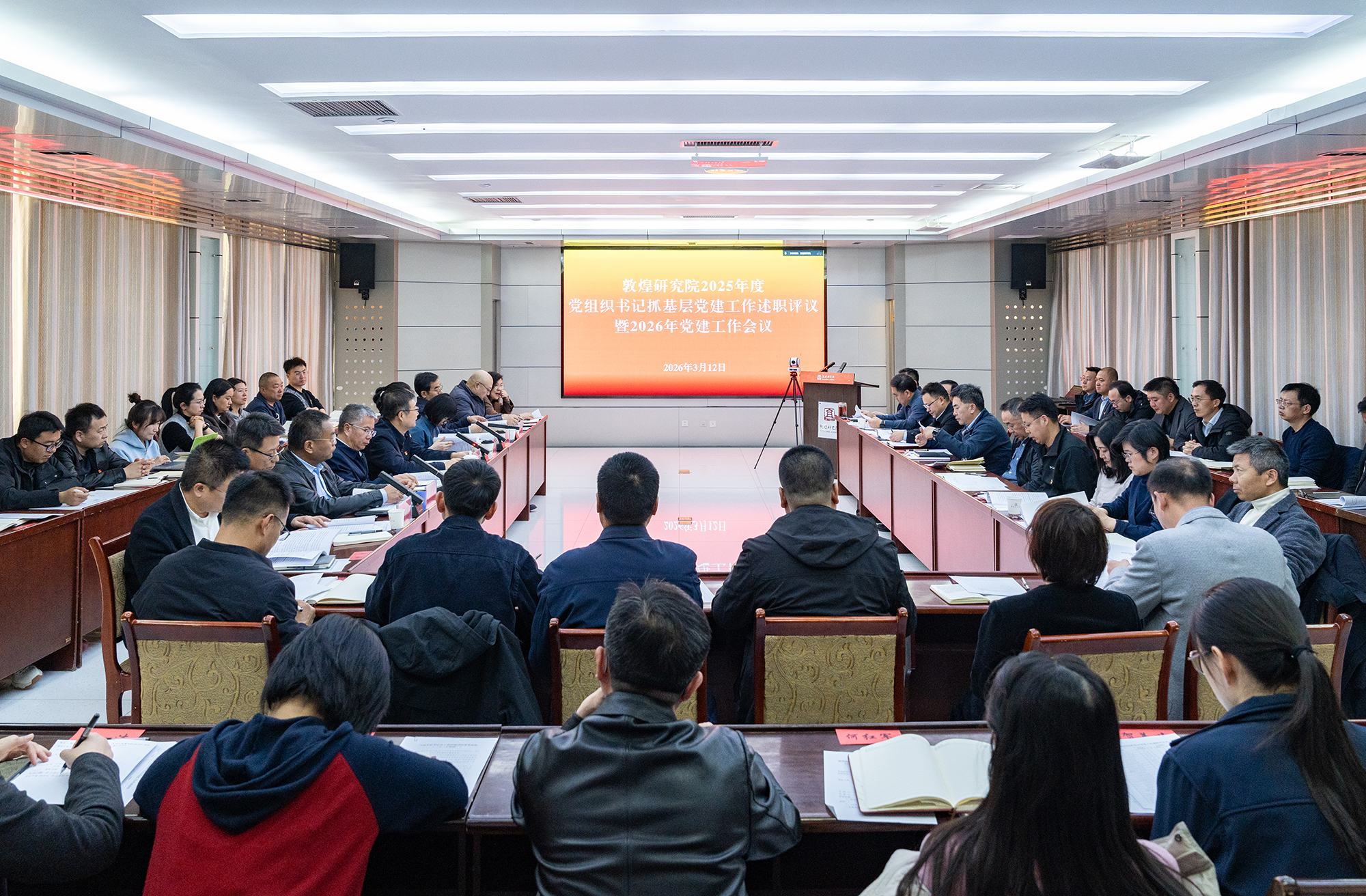 3月12日,敦煌研究院召开2025年度党组织书记抓基层党建工作述职评议暨2026年党建工作会议。院领导班子成员、院党委委员出席会议,全院各党总支(党支部)书记、副书记和部分支部委员,部分单位(部门、企业)负责人,部分党员和职工代表等共计100余人参加会议,院党委书记程亮主持会议并讲话。会议现场会议传达学习了习近平总书记关于党的建设的重要思想相关内容。会上,保护研究所党支部、敦煌学信息中心党支部、人力资源处党....